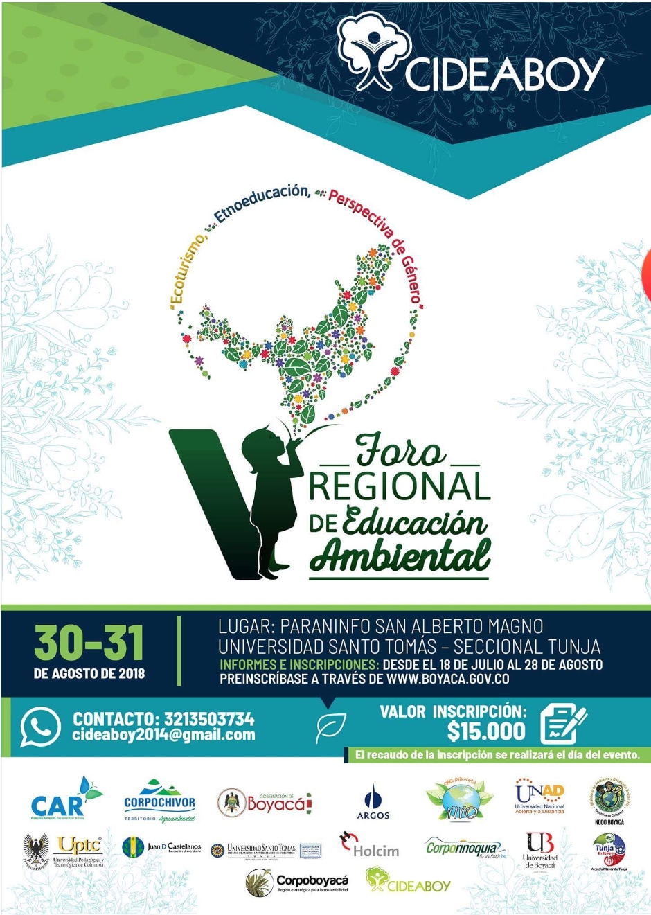 La Secretaría de Educación de Boyacá invita a los Rectores(as), Coordinadores(as) y Docentes que orientan la Educación Ambiental y PRAE en las Instituciones Educativas, a participar en el 5° Foro Regional de Educación Ambiental, Tema: “ECOTURISMO, ETNOEDUCACION Y PERSPECTIVA DE GÉNERO”, organizado por el Comité Departamental de Educación Ambiental de Boyacá – CIDEABOY, evento que se desarrollará durante los días 30 y 31 de agosto del presente año, en el paraninfo San Alberto Magno de la Universidad Santo Tomás, sede Tunja. Las inscripciones se hacen en el Link https://docs.google.com/forms/d/e/1FAIpQLSdB3W_AzO4CfxuXX5lJg_28ZpeWspJAB7ATuFtImnLSpKBF5g/viewform?c=0&w=1, el recaudo de la inscripción se hará el día del evento y el valor de la inscripción $15.000, por persona que incluye la participación a los dos días del foro, certificado y memorias.